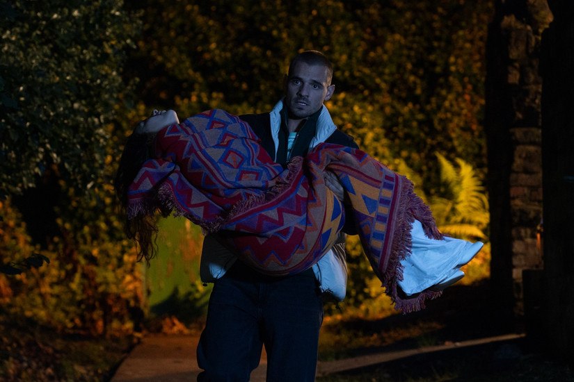 Unable to bring Cleo round, Abe panics, wraps her up in a blanket and bungs her into his car, before throwing away his wedding ring from Cleo.